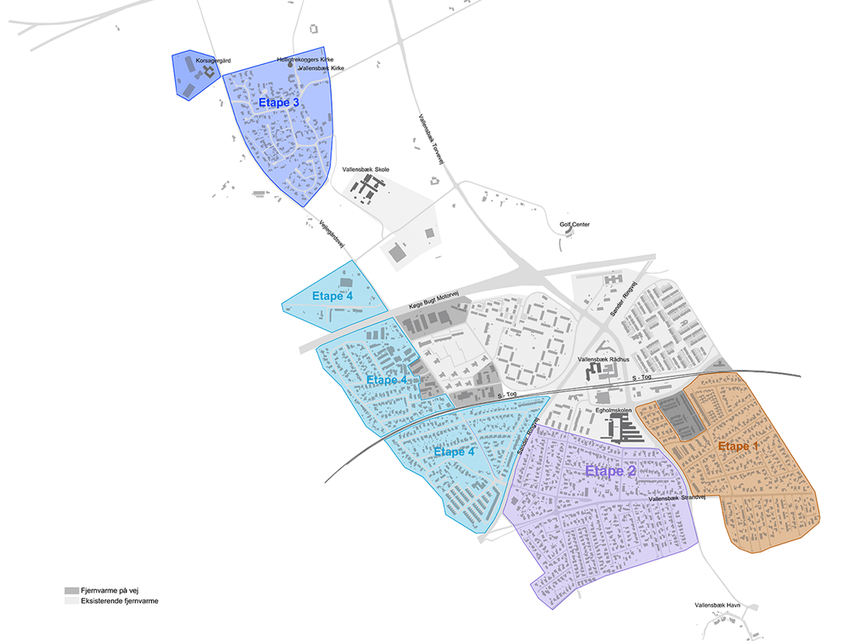 Vores tidsplan og udrulningsplan er foreløbige og kan derfor ændre sig undervejs. Vi informerer selvfølgelig på hjemmesiden, når og hvis det sker. Hver etape forudsætter, at 65% af forbrugerne takker ja til fjernvarme.